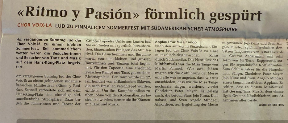 Als am 25. Juni 2023 Chorgesang und Tangomusik aufeinandertrafen, verwandelten wir die Klosterkirche Sursee in einen lebendigen argentinischen Dorfplatz. Gemeinsam mit den Musikern Sven Angelo Mindeci (Akkordeon) und Jojo Kunz (Kontrabass) begeisterten wir das Publikum mit der rhythmisch-feurigen «Misa Tango» von Martìn Palmeri.